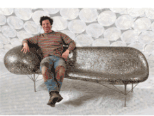 Taking common, everyday materials and repurposing them, Swing has created practical art that is as stunning to view as it is stimulating and comfortable to use. Johnny Swing's "repurposed" art comprises an astonishing inventive aesthetic: glorious chandeliers and chairs made out of baby-food jars, sturdy chairs and benches of welded I-beams perfect for outdoor scupture gardens and displays, and of course, his signature coin furniture of quarters, nickels, "loose change," and half-dollars. Swing's philosophy about his creations is that they are functional furniture creations, as well as unique pieces of sculpture. Johnny Swing's nickel couch, made from 15,000 nickels held together in a sheer layer by 35,000 welds, was featured recently on the cover of Art and Antiques magazine with noted designer Jack Lenor Larsen.