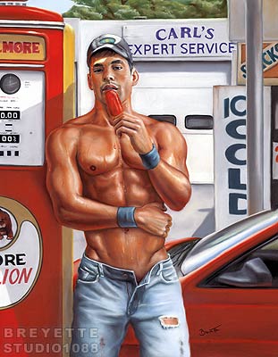 "Taking the back roads on a hot summer day, it is still possible to find a gas station that offers full service. You pull up to the pumps where you notice a young sweaty attendant trying to keep his cool by licking on a Popsicle. As you roll down the window the icy a/c gives way to the hot billowing summer air. You can't help but let your mind wander as he asks "Fill it?" with his glistening cherry flavored lips."
